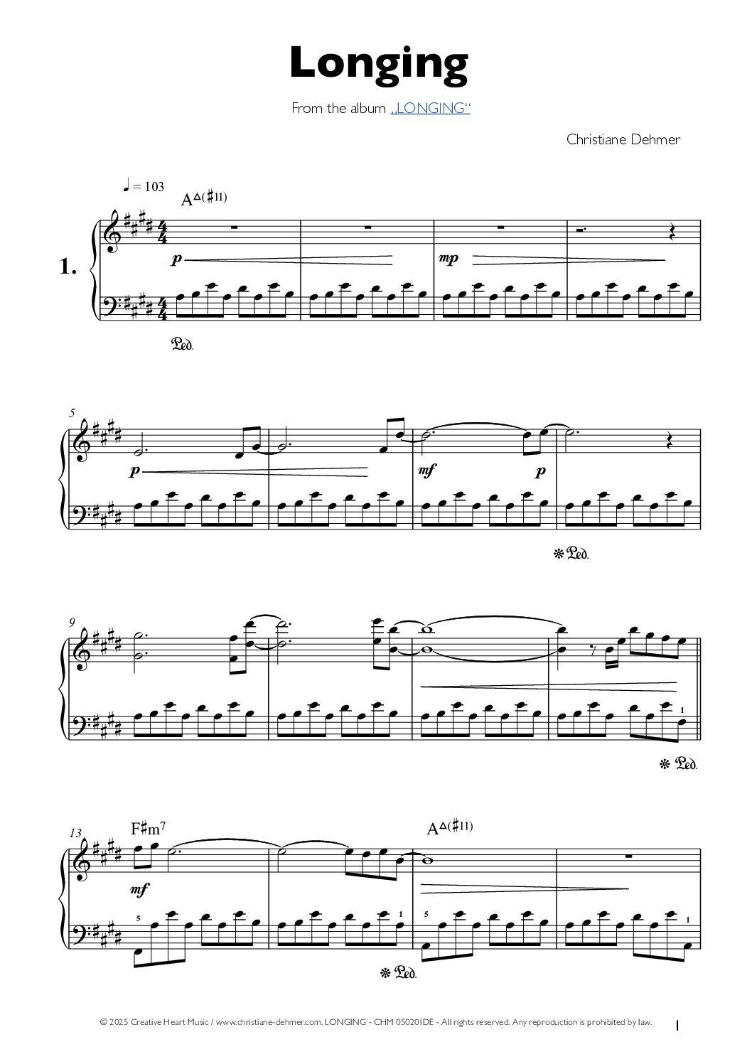 Eleven Lyrical Piano Pieces from the album “Longing” by Christiane Dehmer. 53 pages, A4.